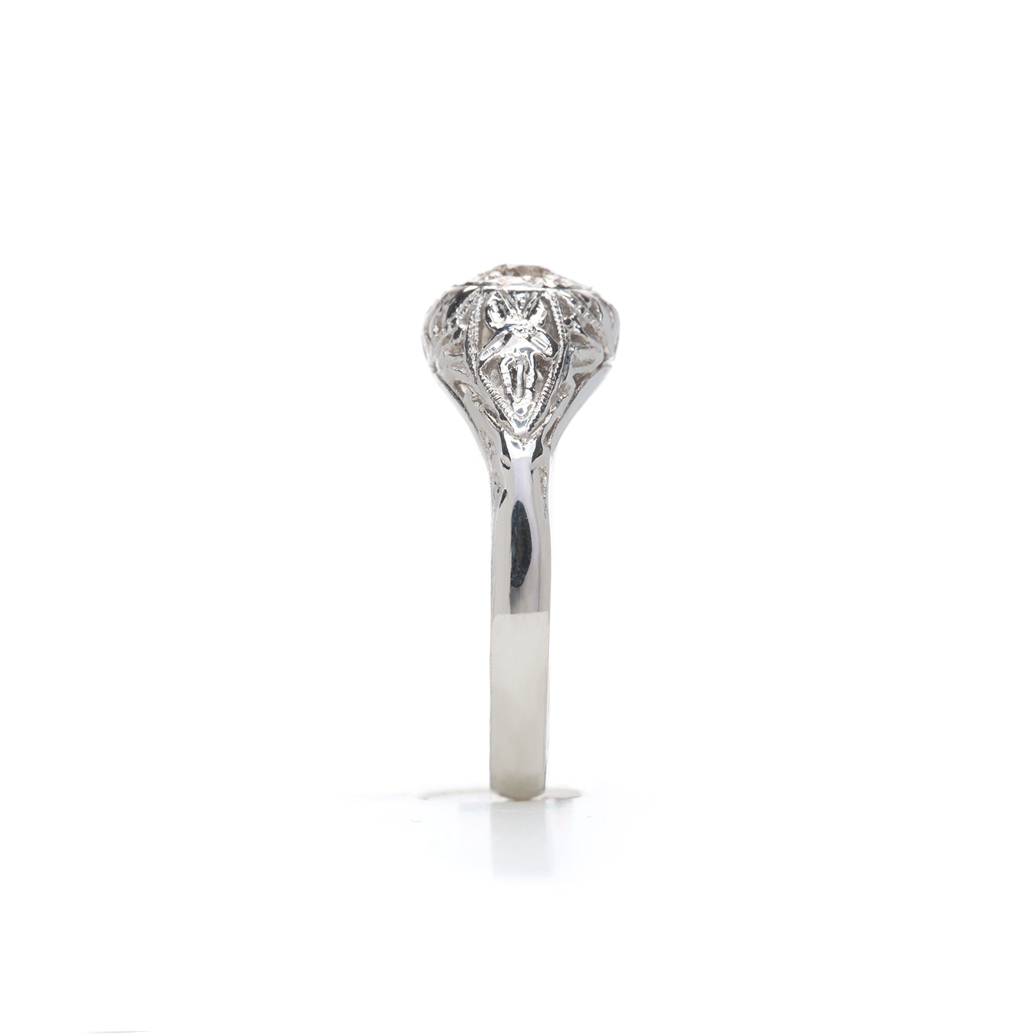 This ring is designed with an antique style. A solitaire round brilliant diamond is gypsy set in a 14k white gold setting.