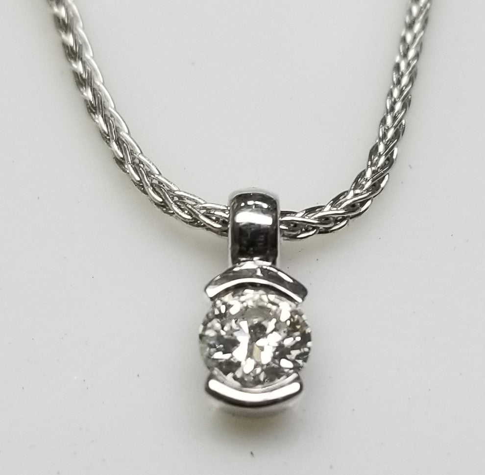 14K white gold pendant 1/2 bezel set with a 0.33 carat diamond and with a 14K white gold wheat chain