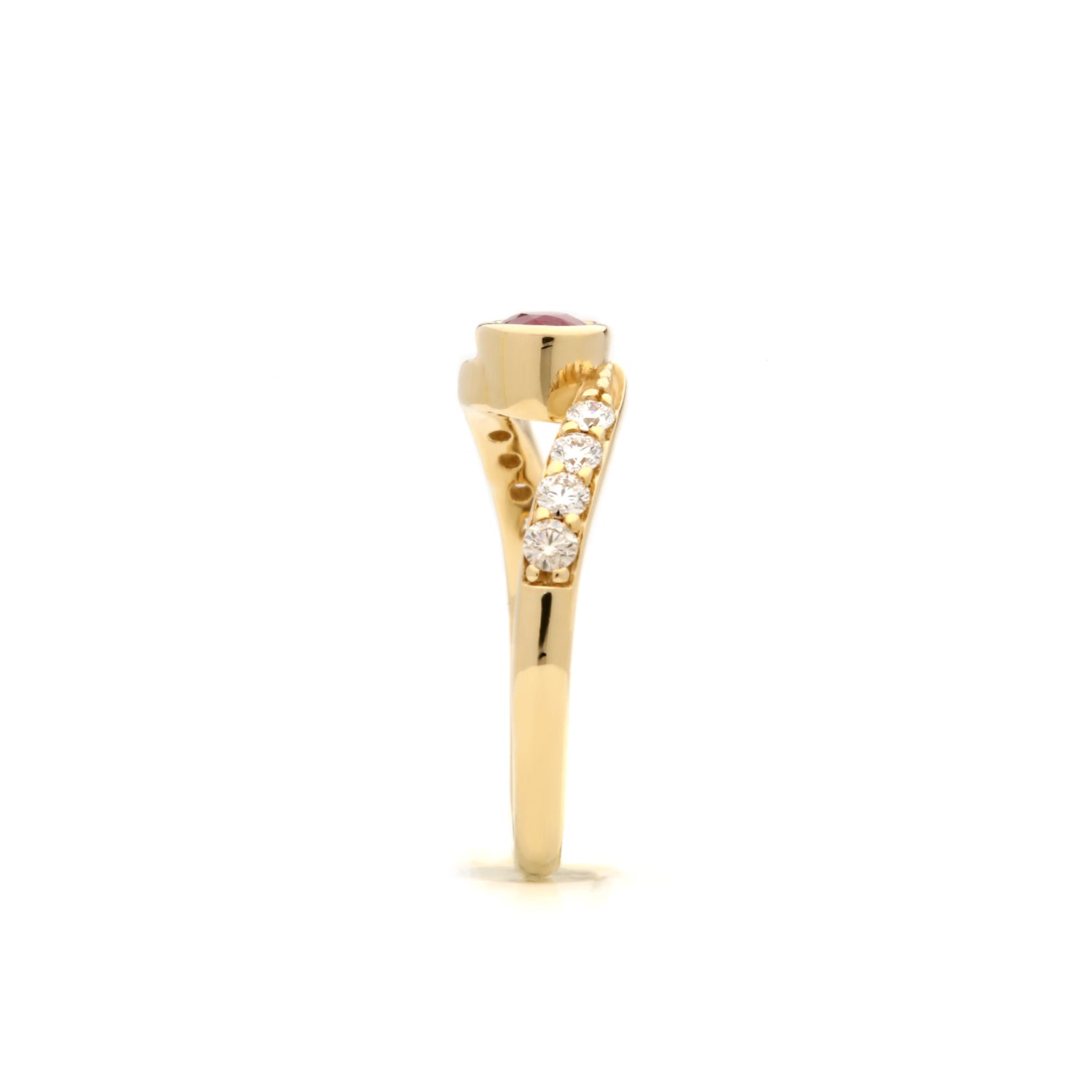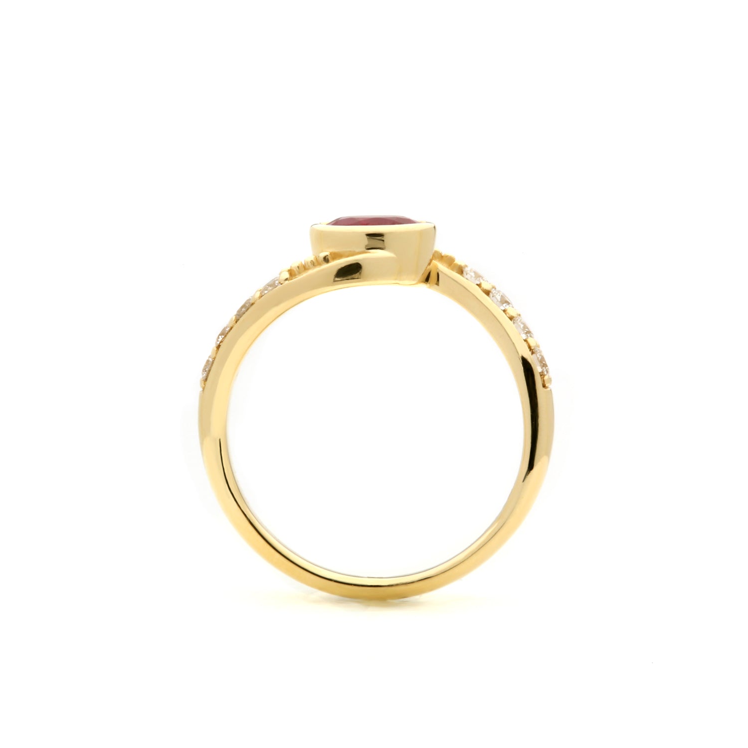 This ring is made in 14k yellow gold. One oval cut natural red ruby totalling over a 1/2ct is bezel set as the centre stone. 8 natural round brilliant cut diamonds are pavé set into the top of the band. This ring is a stunning accessory to any special occasion.