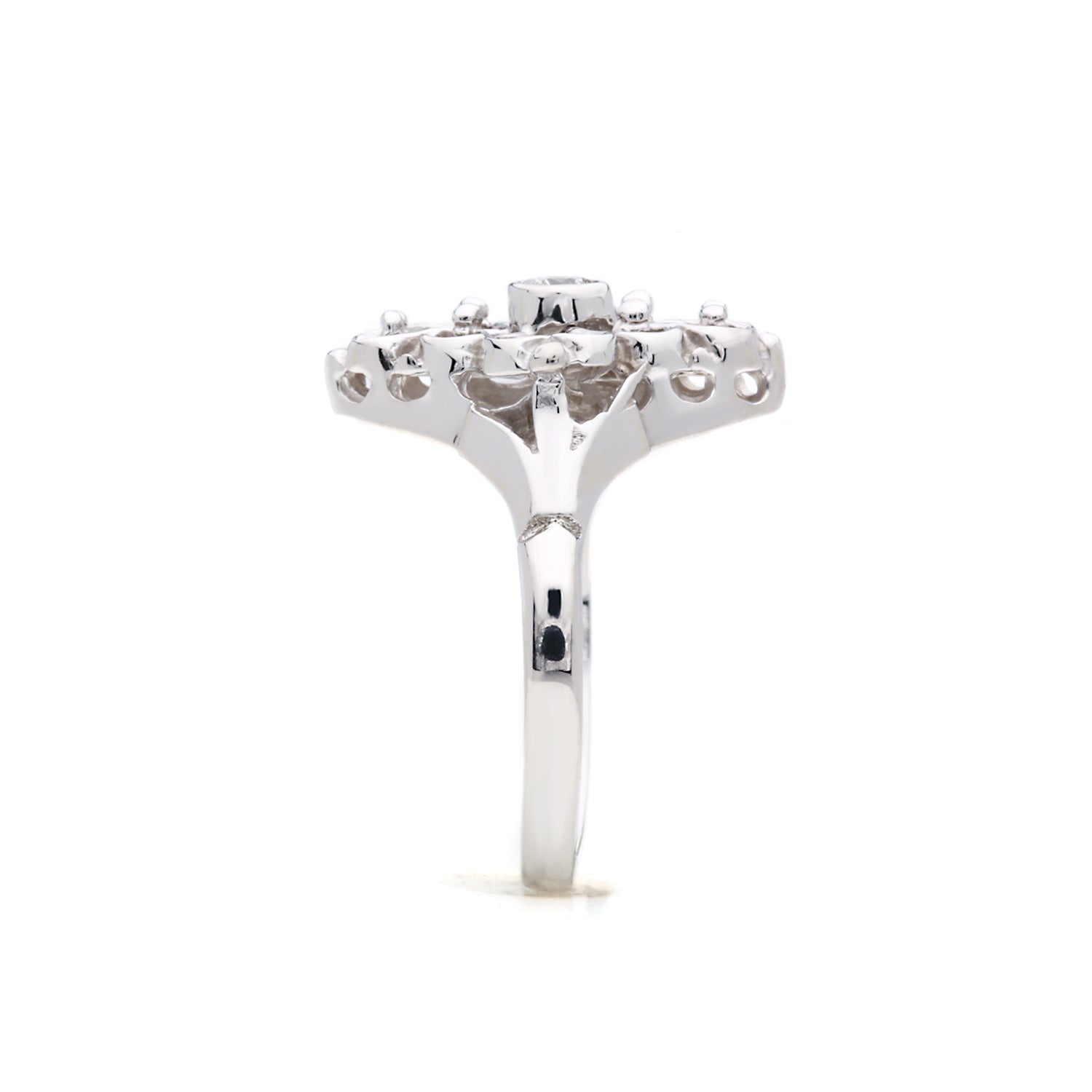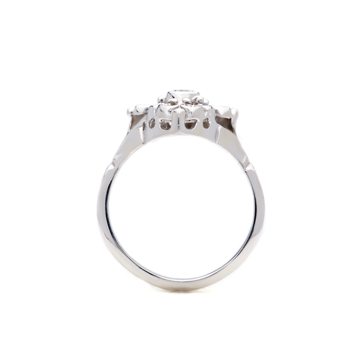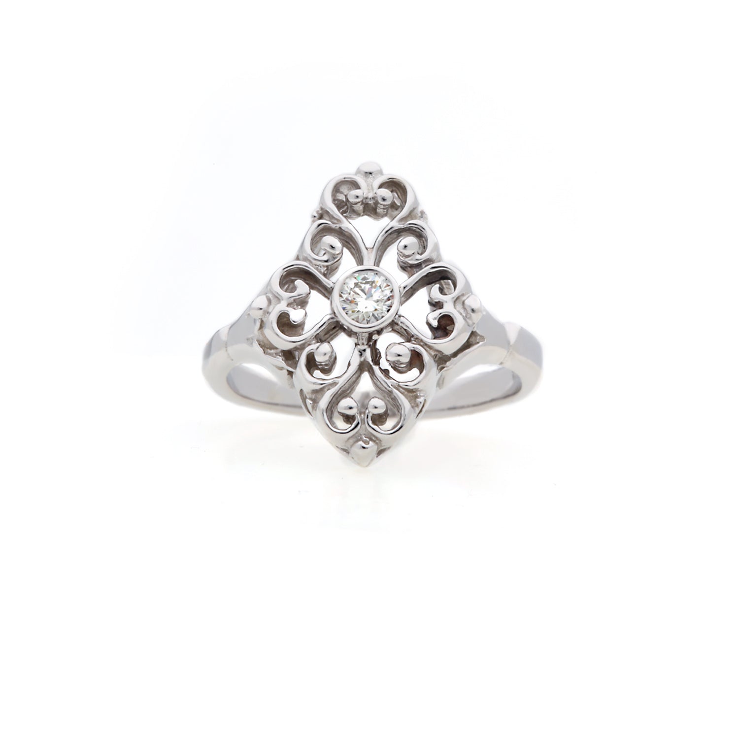This is a true inspiration from antique designs. The filigree metal work flares out 8mm into a marquis shape with single .20ct diamond set in a white gold bezel.