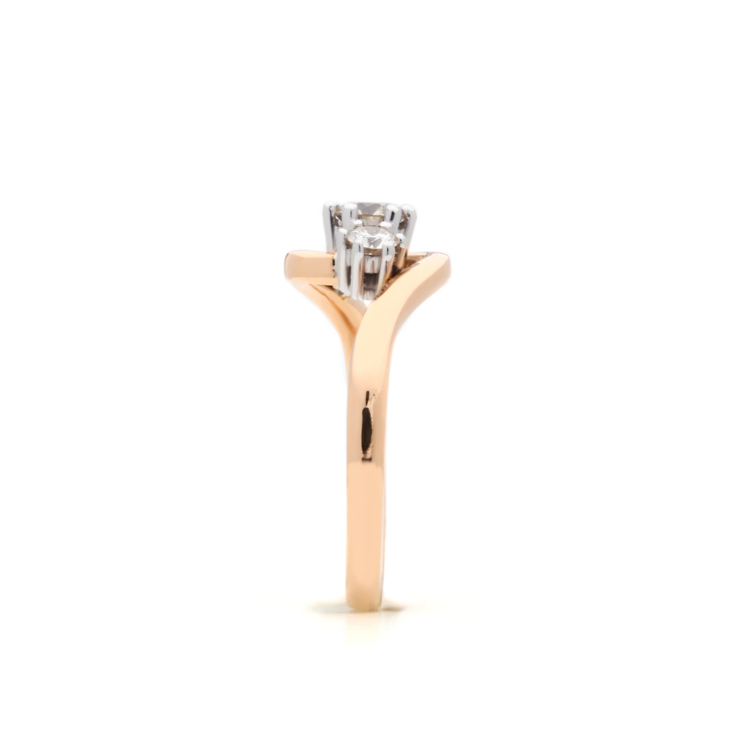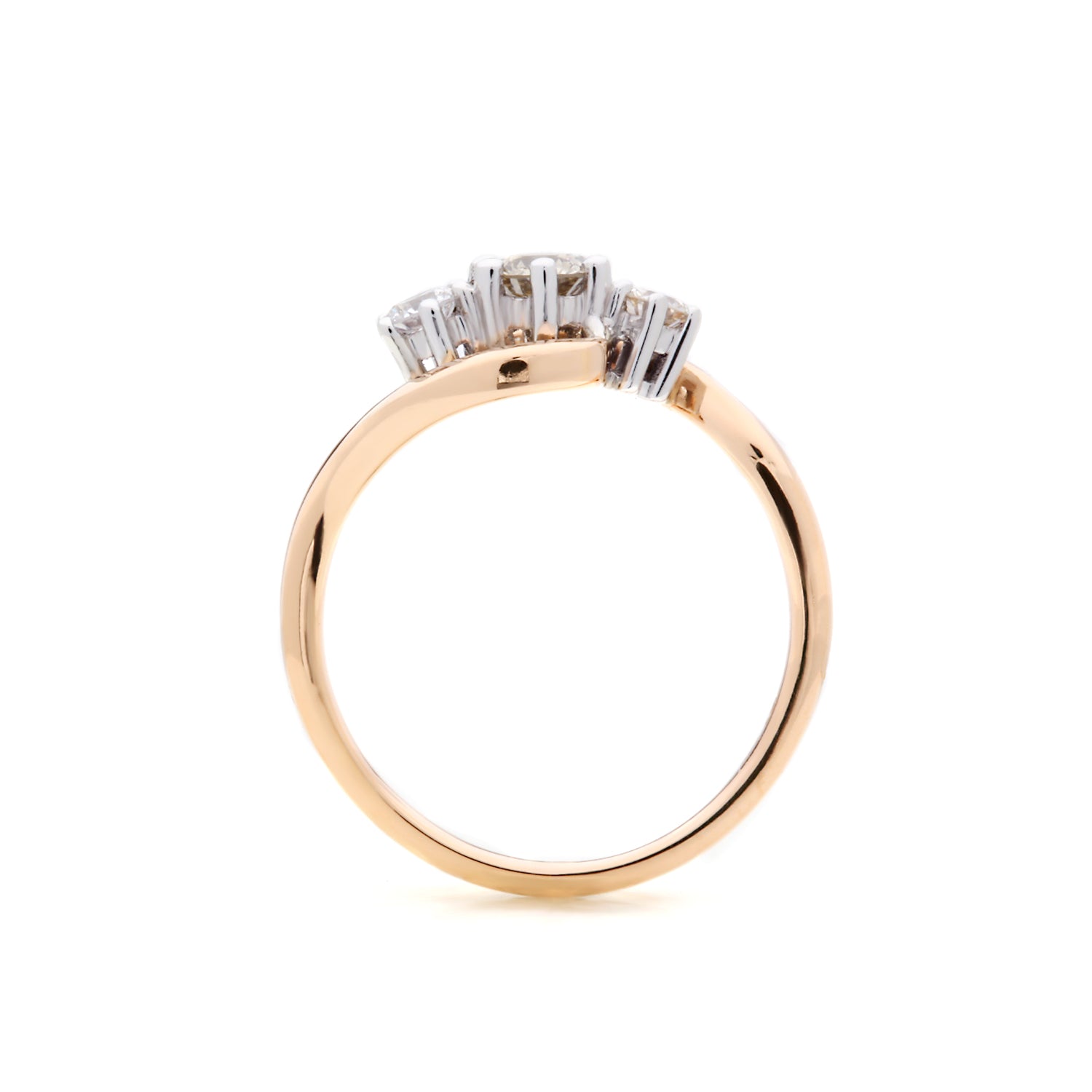 Similar to Jaylyn Astraea, this ring has a regal setting. Each of the three brilliant round cut diamonds are set with 6 white gold claws that resemble royal tiaras. The 14k rosé gold band wraps around the setting pulling focus to the scintillating centre stones.