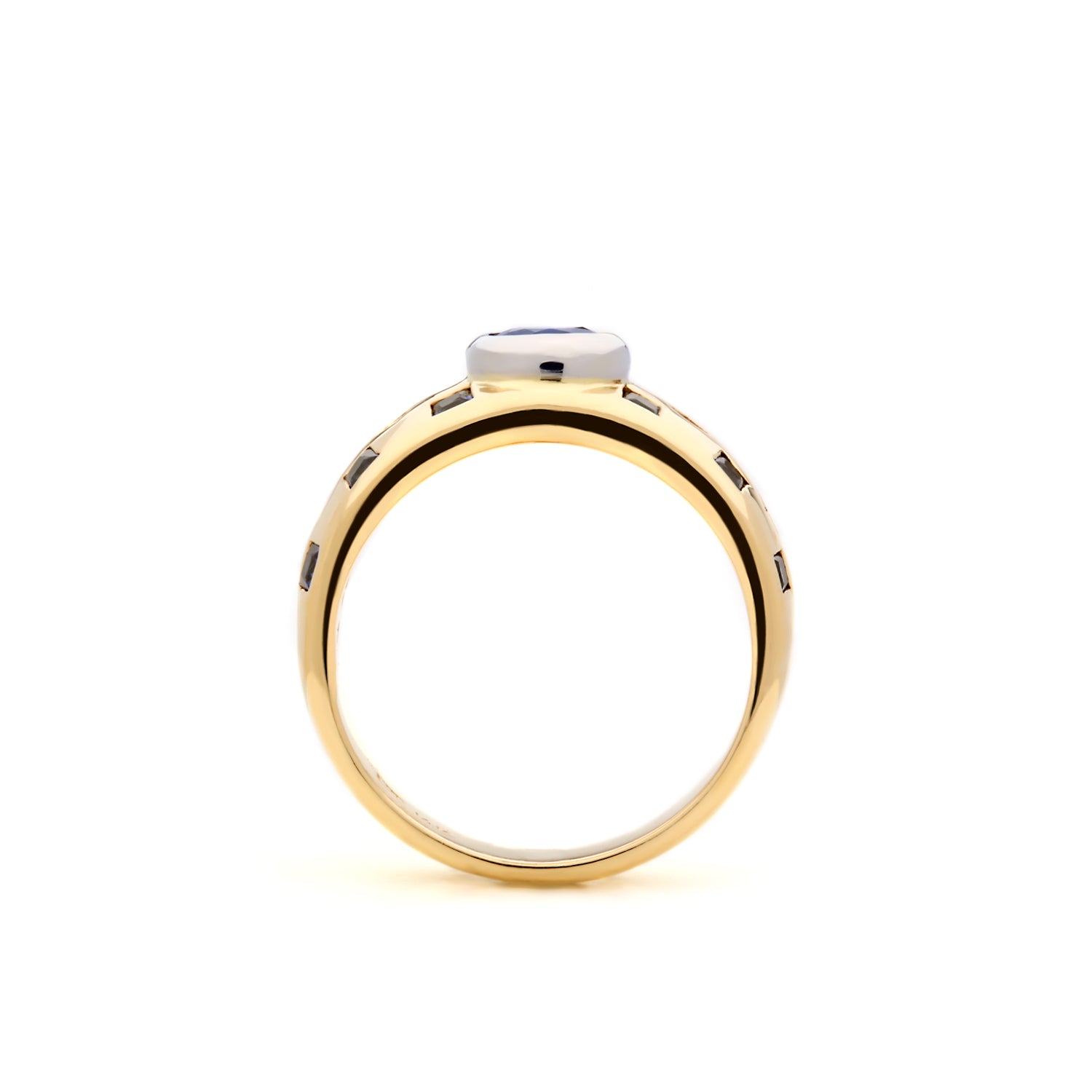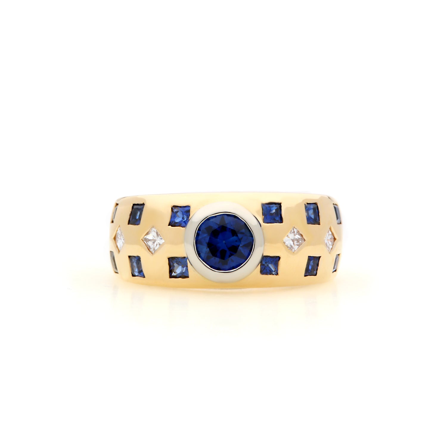 Named after the Greek goddesses of charm, beauty, and nature. This ring has an abundance of those traits. The centre stone is a natural .73ct blue sapphire set in a 14k white gold bezel setting. Along the 14k yellow gold band 12 princess cut natural blue sapphires and 6 princess cut diamonds are pavé set in a geometric symmetrical pattern.