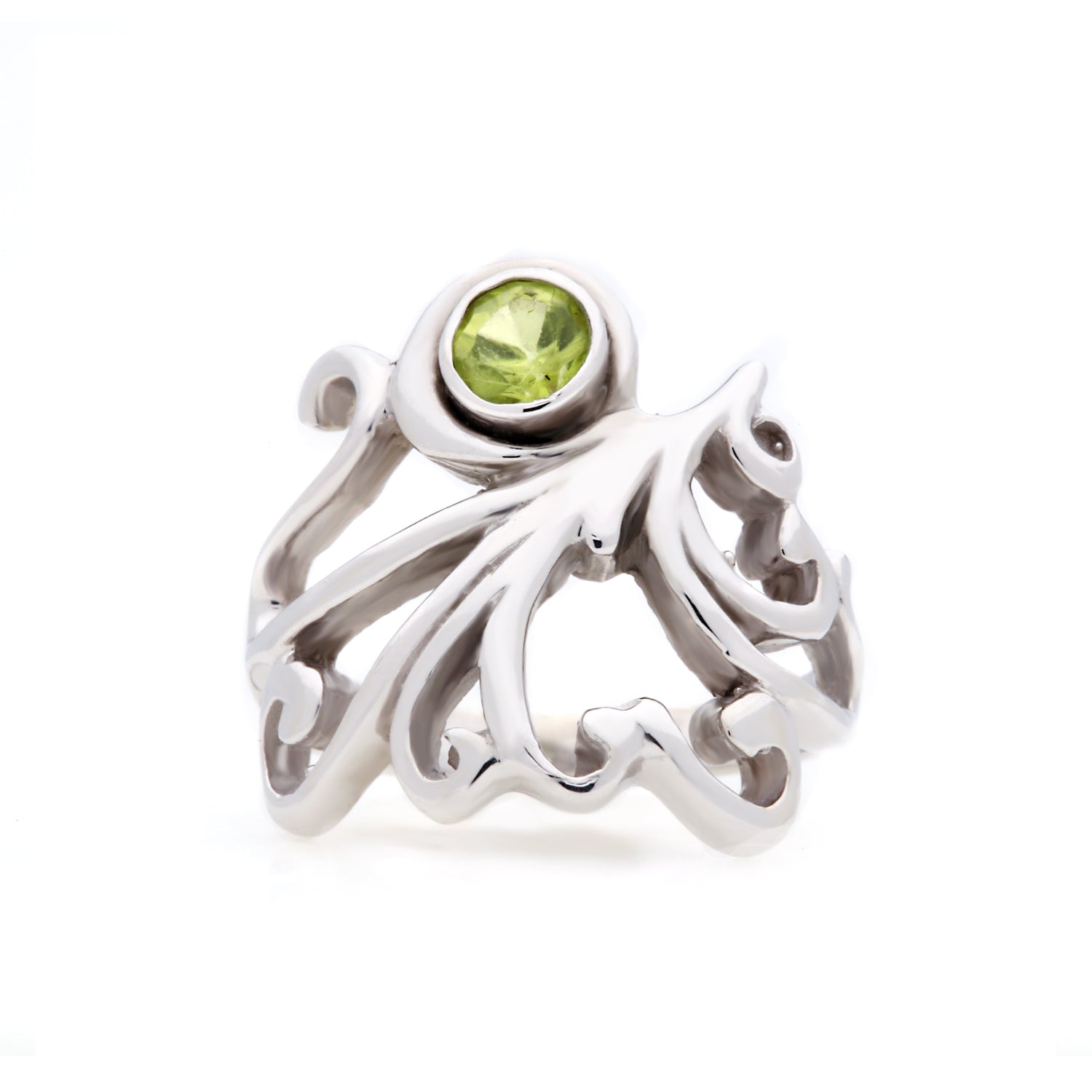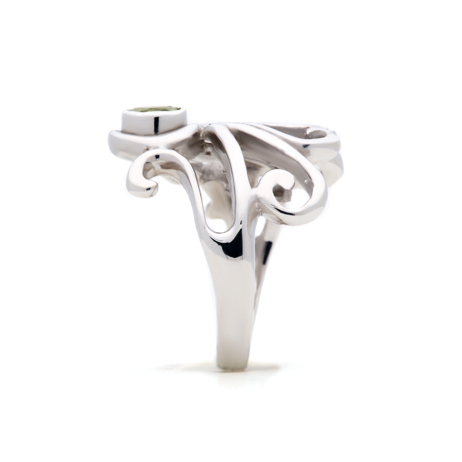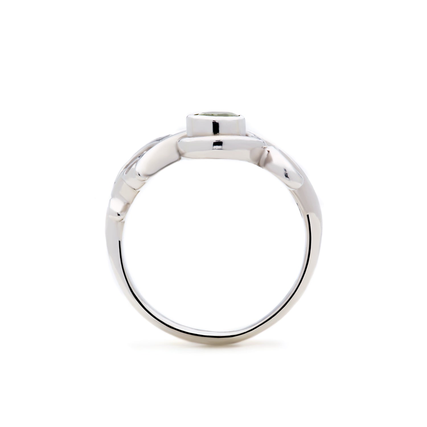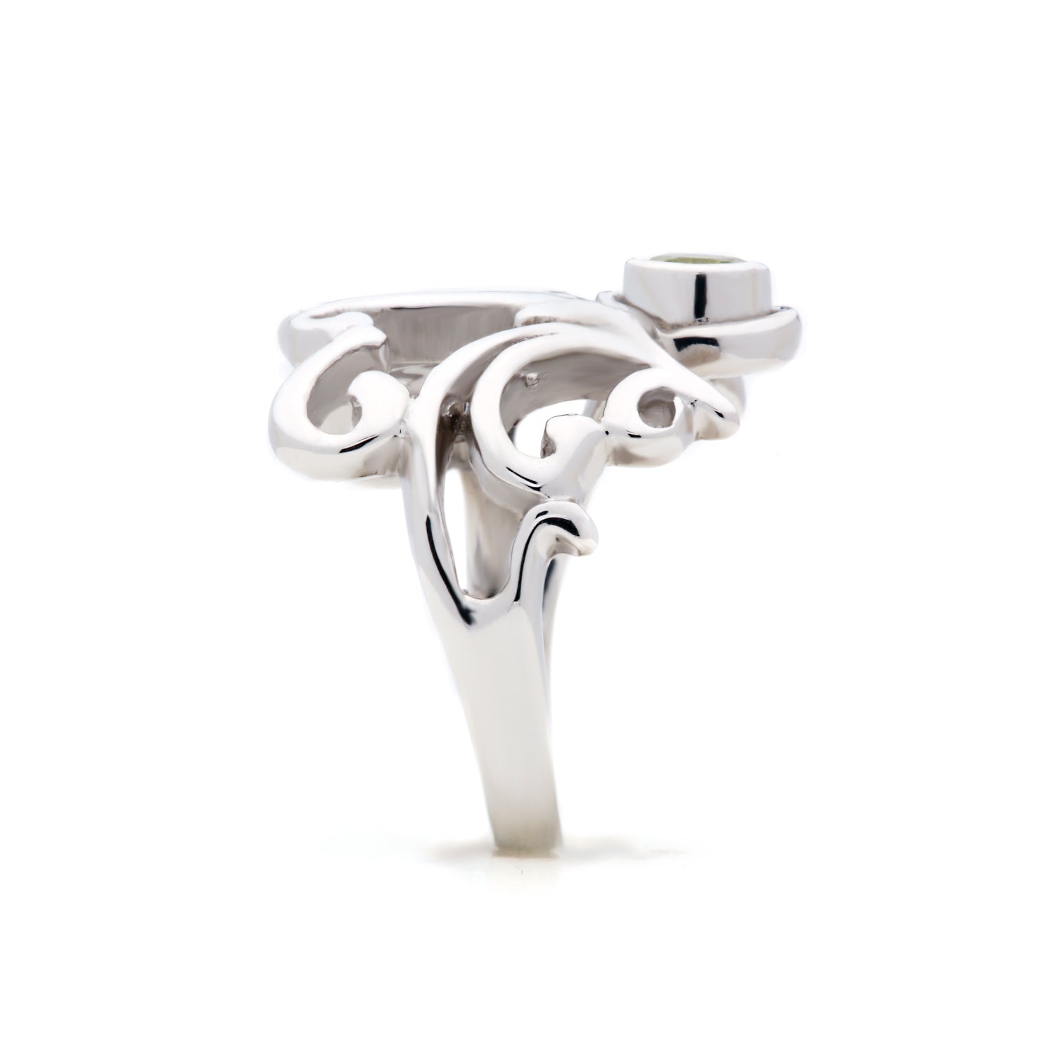 This 14k white gold ring has a freeform design with a touch of inspiration from vines. The natural green peridot gem is set in a full bezel at .25ct.
