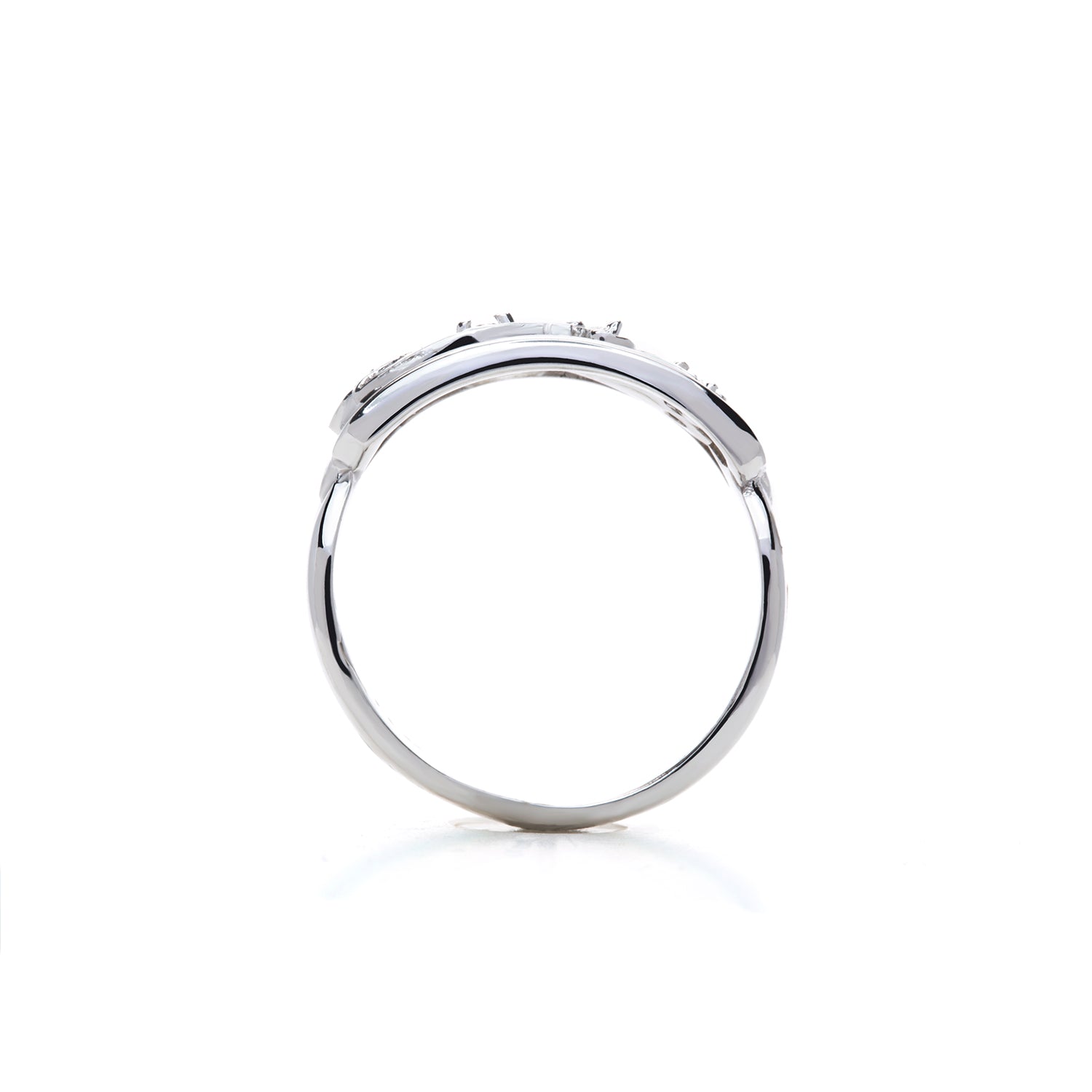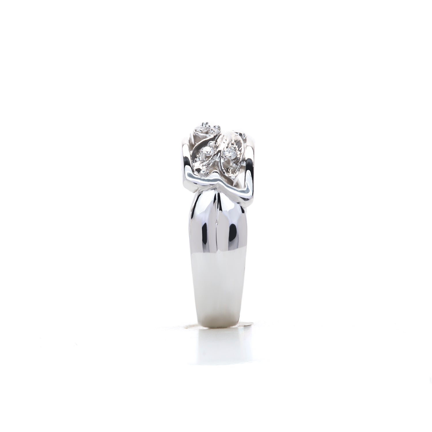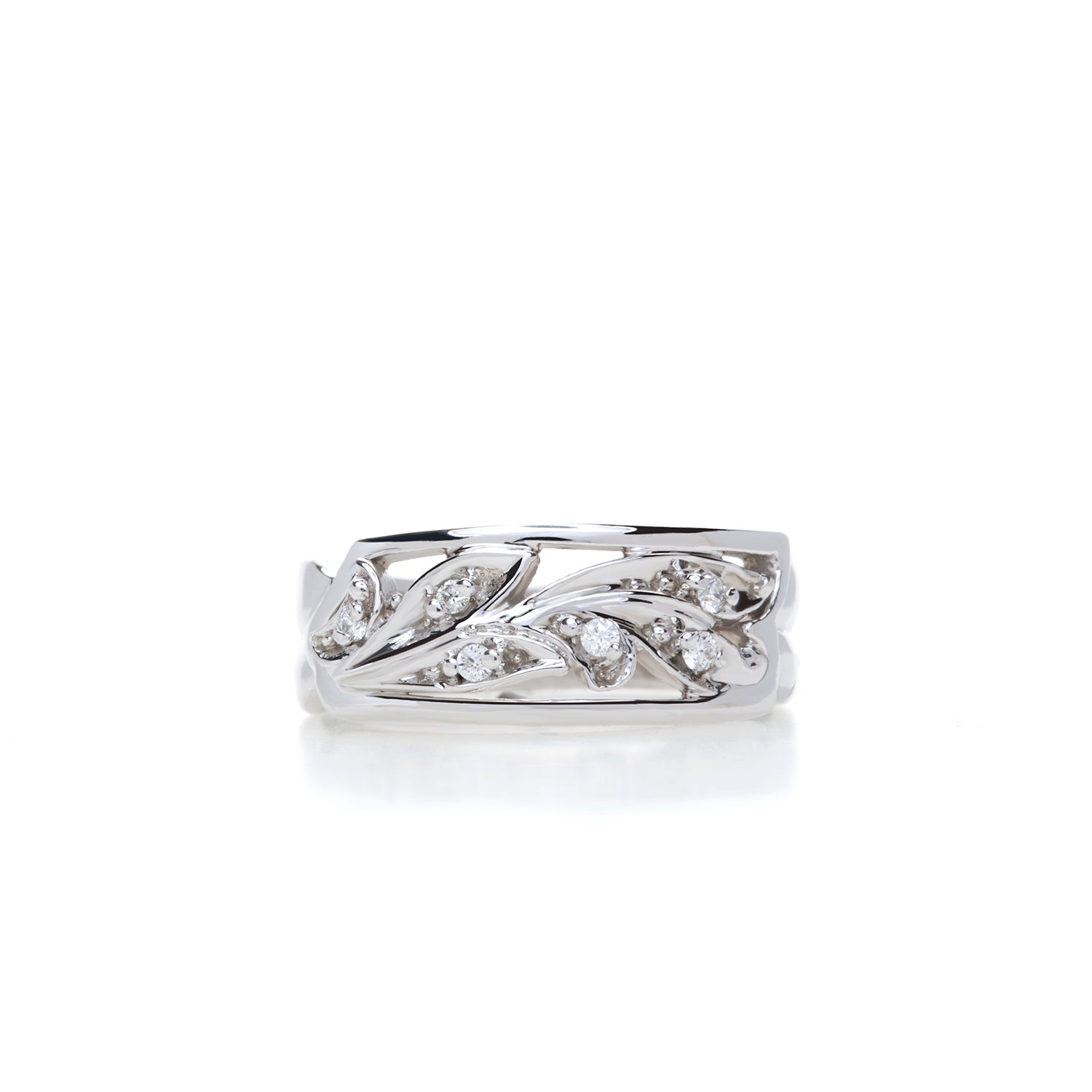 The main setting of this ring is in a fillagree design with diamonds set on each leaf. It's has a natural femininity that is easy to wear on its own or stack on others to expand and enhance the striking design. 6 diamonds are set with claws in 14k white gold.