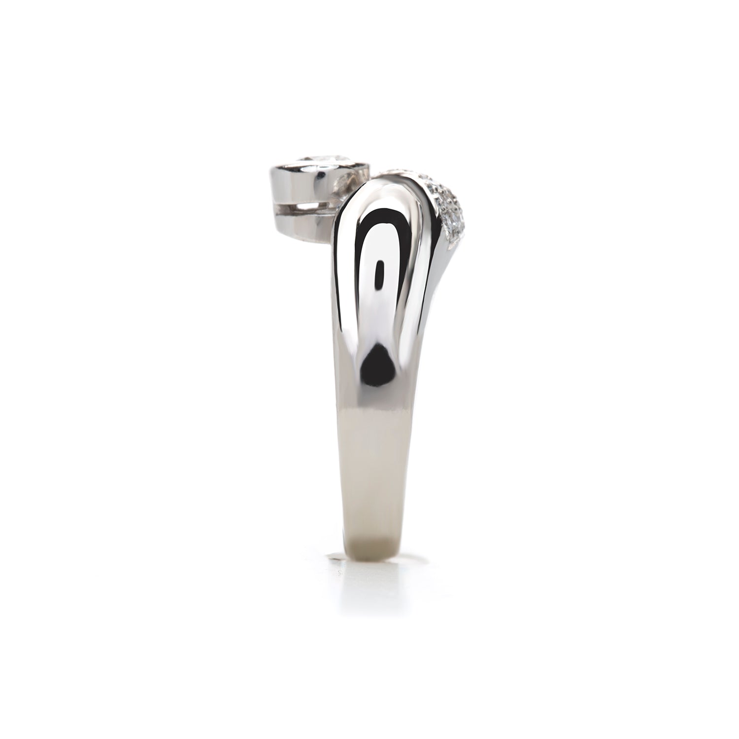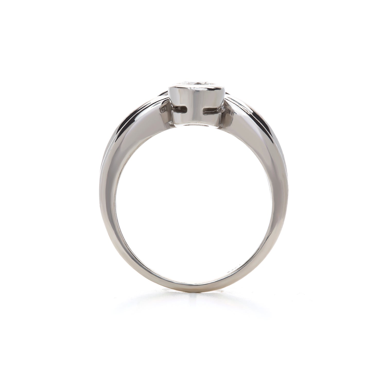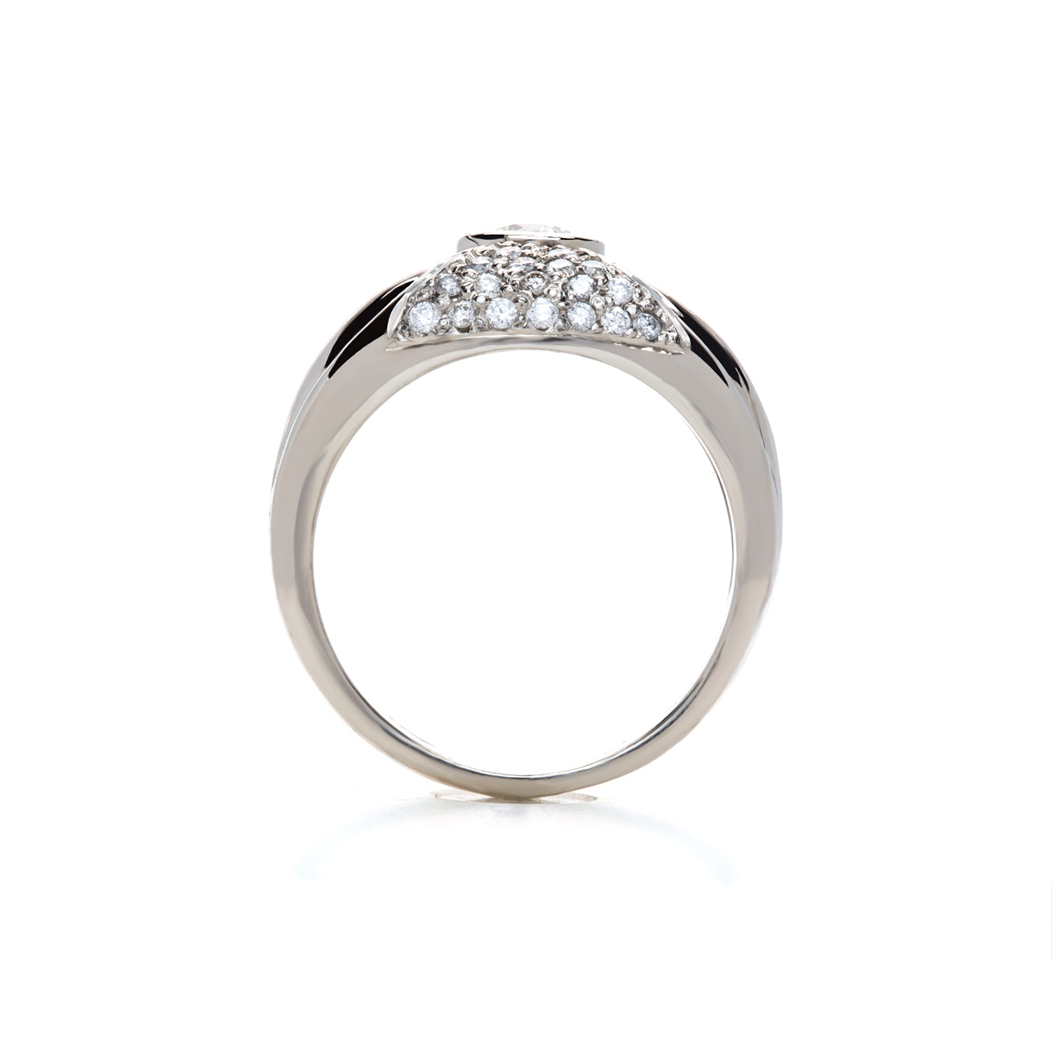 This uniquely stunning design has one large .35ct round brilliant cut diamond in a white gold bezel. The setting seems to cascade into a 20 pavé set cluster of diamonds.