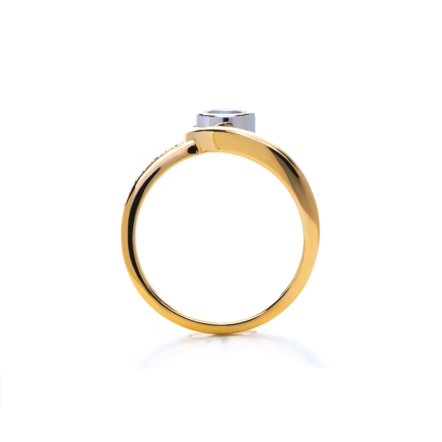 A modern design with sweeping lines that accompany a nearly half carat blue sapphire set in a 14k white gold full bezel. 17 round brilliant cut diamonds are pavé set in 14k yellow gold band.