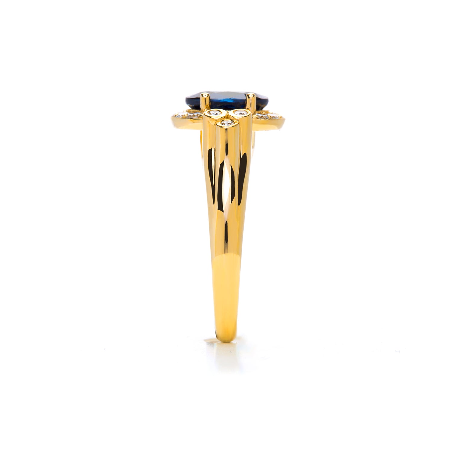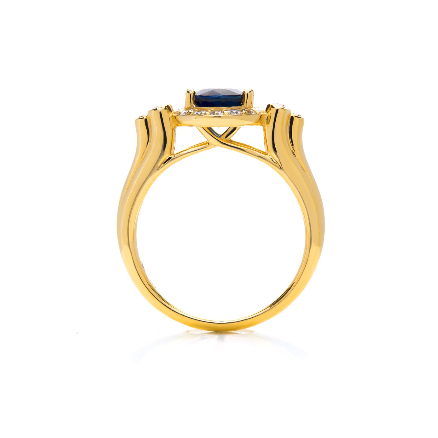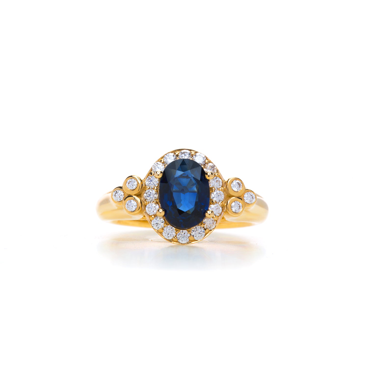 This ring is fit for the royals. The impressively rich blue oval sapphire is over 1.5ct, set in 4 claw yellow gold. Haloing the sapphire are 16 round brilliant cut diamonds pavé set in 14k yellow gold. The shoulders also have 3 round brilliant cut diamonds on either side set in 14k yellow gold bezels.