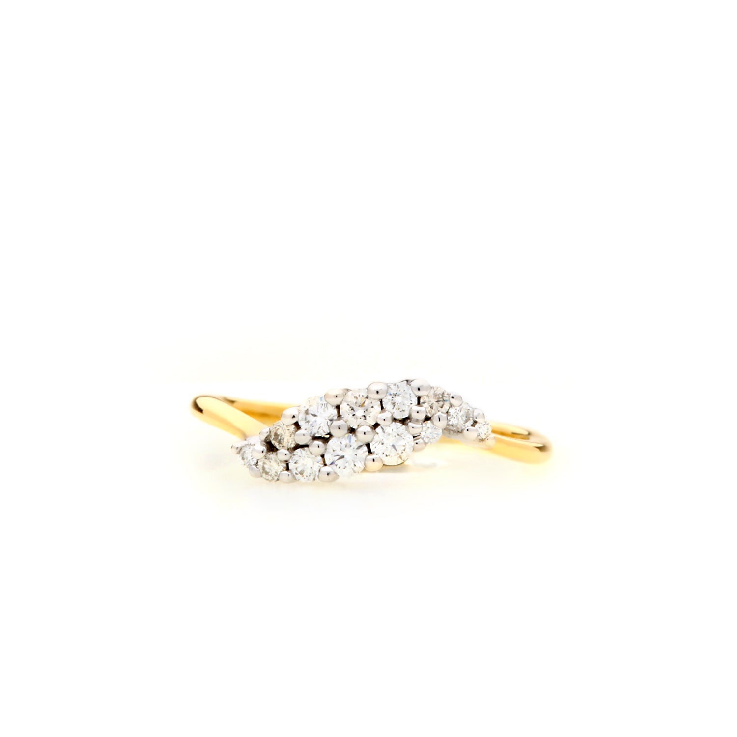 This ring has a striking feminine beauty. The cluster of claw set diamonds total over a 1/4 carat. The two rows perfectly pair together to become one sparkling cluster. The 14k white gold setting extends from the 14k yellow gold band. Wear it as a standalone fashion ring, or custom make another stackable ring to pair with it.