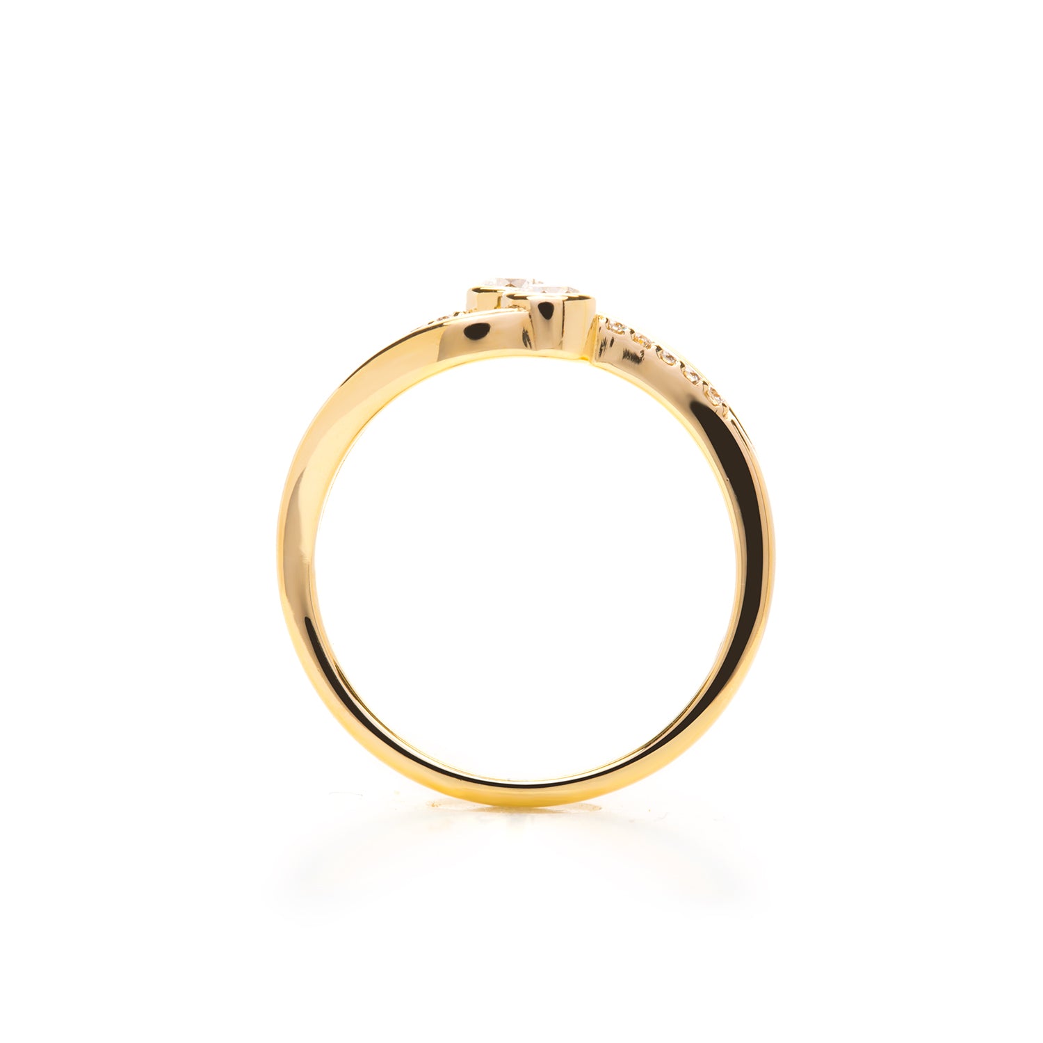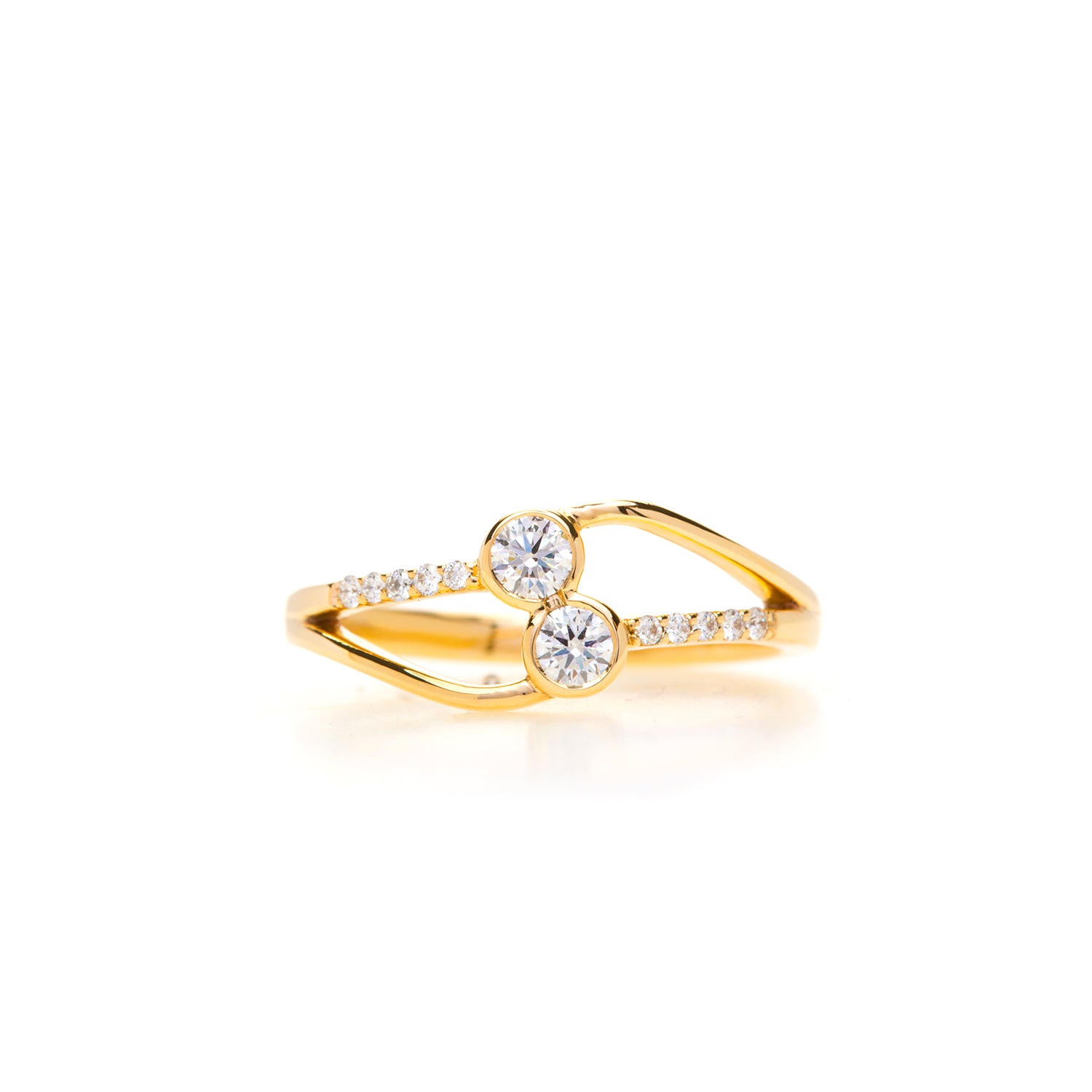 This ring has a similar design to the Jaylyn PR design with more natural curves in the setting. The two main diamonds are securely bezel set with 10 opposing pavé set diamond along the "stems" of the setting. This gorgeous ring is surely to last a lifetime.