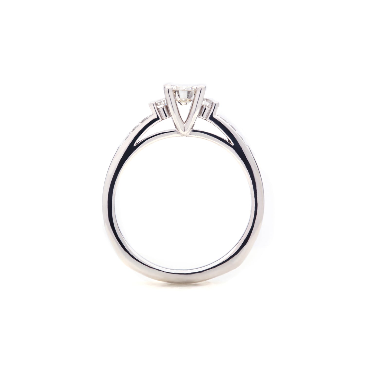 This ring is simply beautiful with 3 tiers of natural round brilliant cut diamonds totalling over 1/5 carat. The centre and 2 side stones are seated in 4 claw settings. While the 6 shoulder stones are pavé set all in 14k white gold. This ring is designed for the new bride in mind.