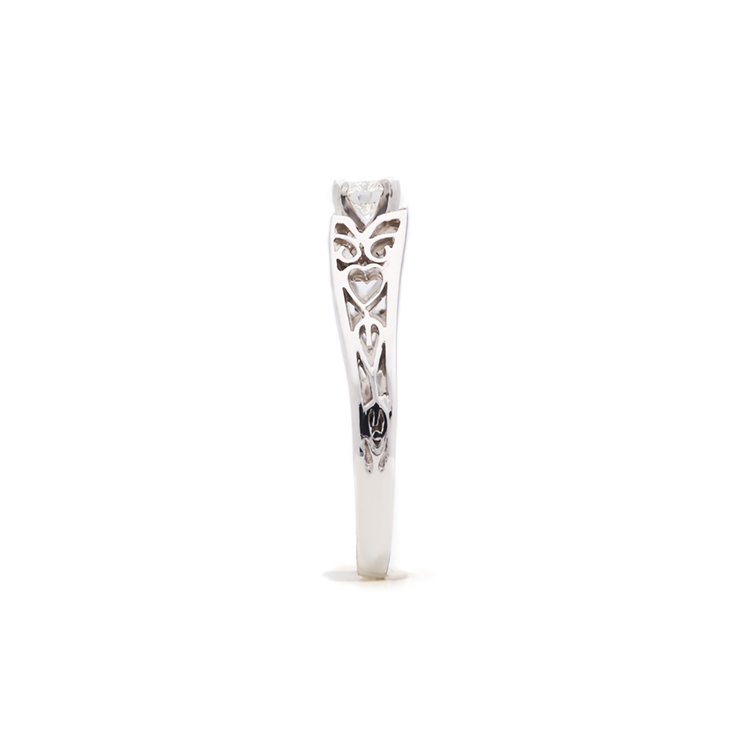 Jaylyn Butterfly is named for the intricate design of the ring that resembles small butterfly wings. Small hearts are centred in each 14k white gold design of the shoulders. A single 0.20ct diamond is set in a 4 claw 14 Karat White Gold setting. Designed with the intention of an engagement, but can be worn as an everyday piece.