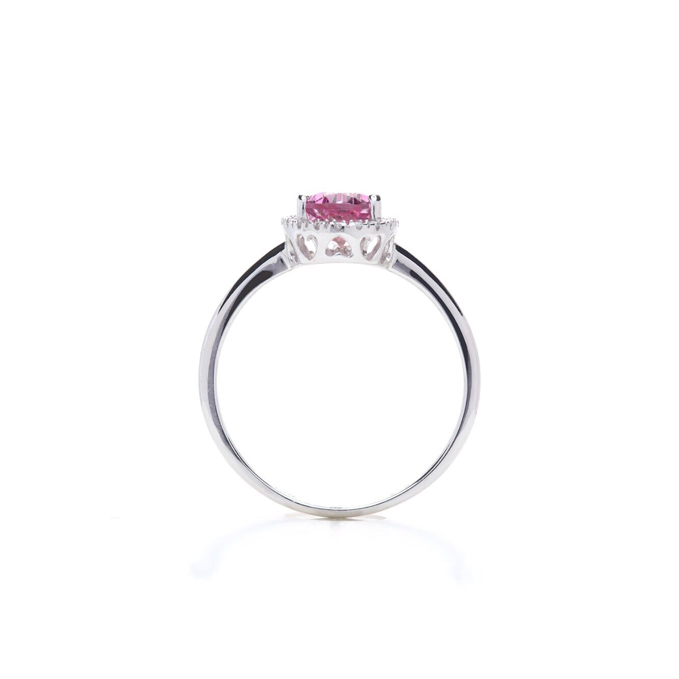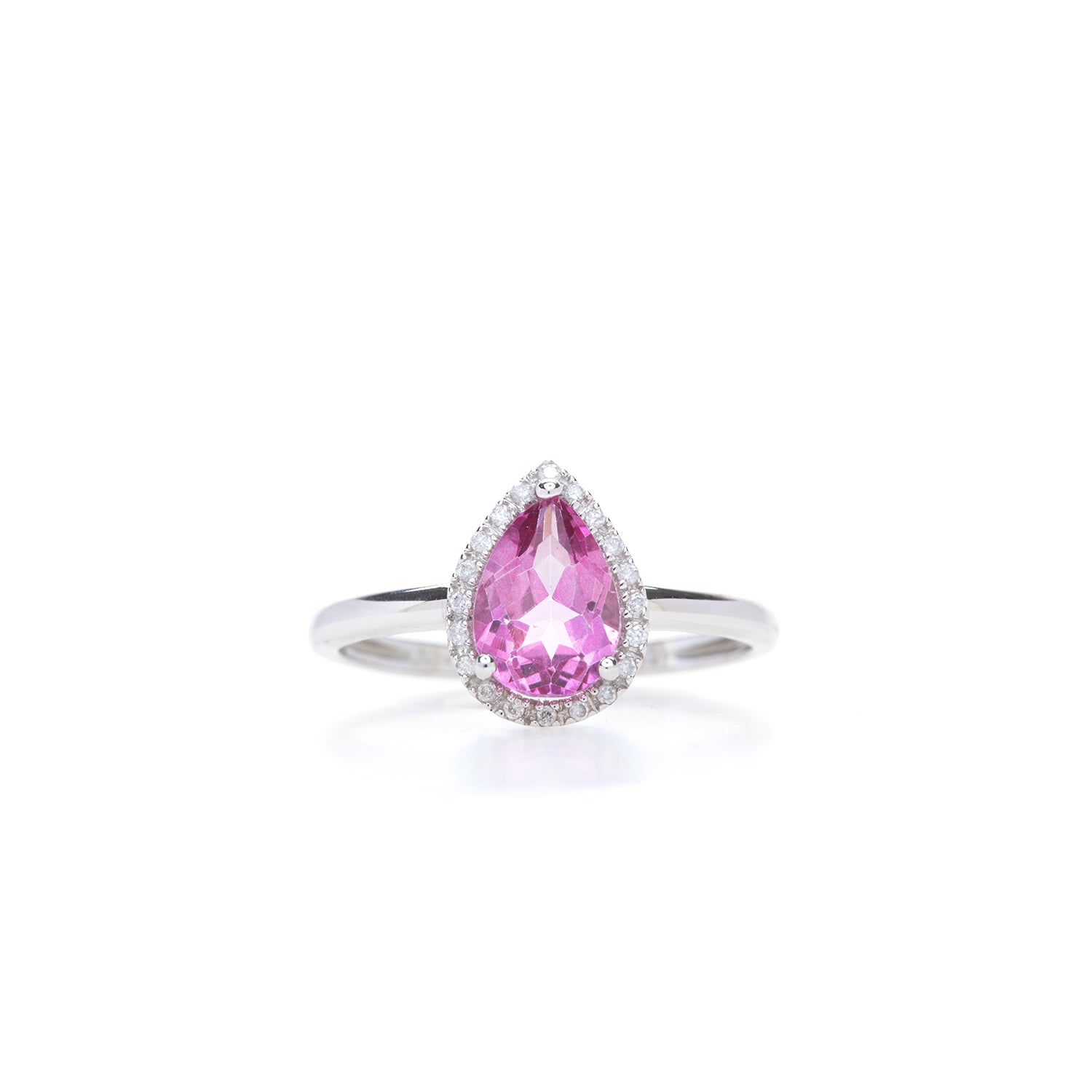 Named after the cherry blossom trees. The pink topaz is cut like the pedal of a flower and is over 1 carat set in a 3 claw 14k white gold setting. A halo of 20 diamonds are prong set around the topaz. The band is 14k white gold and perfect for an everyday fashion ring.
