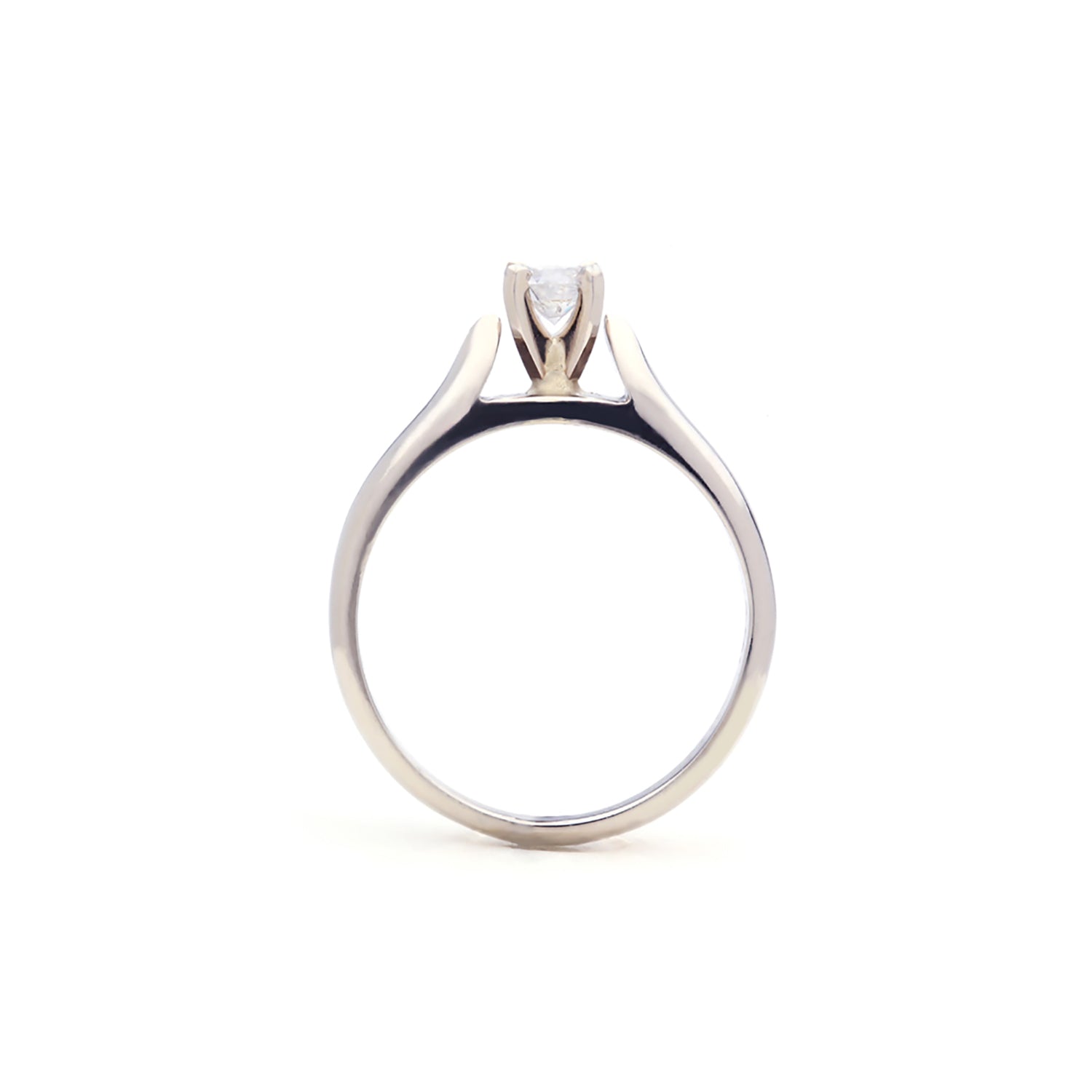 A classic 4 claw 14 karat white gold solitaire engagement ring. The band sweeps up and narrows in a ski tip design that centres the true star of this ring, the nearly 1/4ct round brilliant cut diamond. The quality of this diamond is amazing.