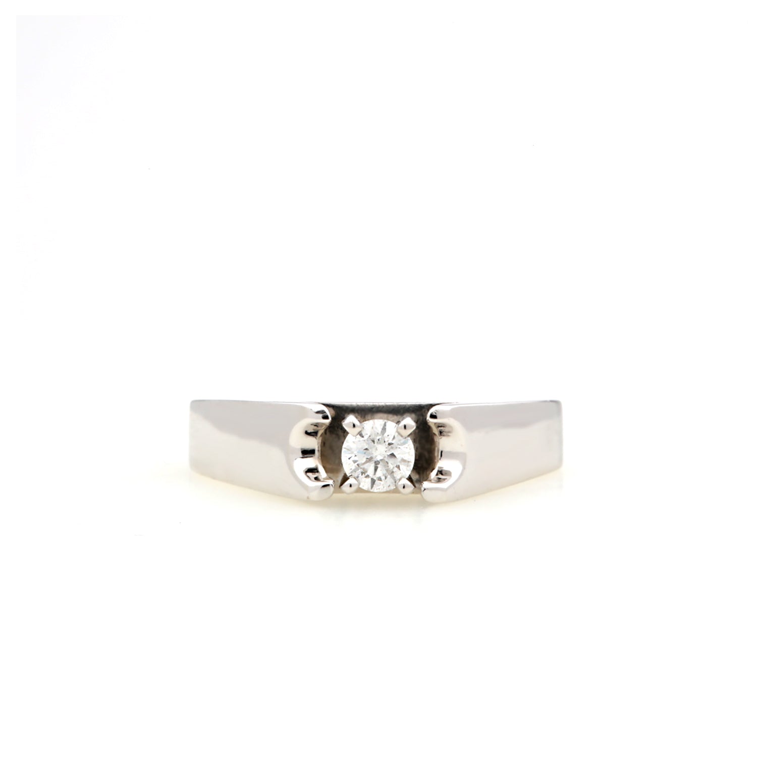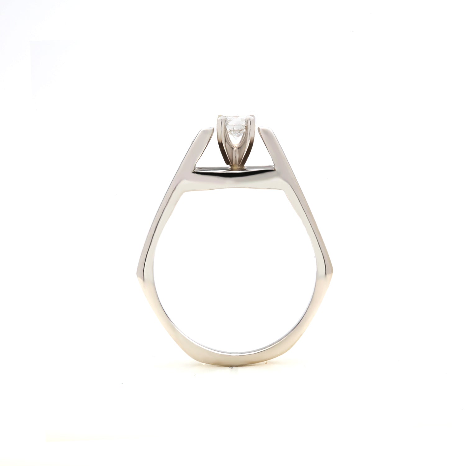 This engagement ring has a unique profile with defined angels on the band. It peaks on either side of the 4 claw setting, which holds a single natural round brilliant cut diamond.