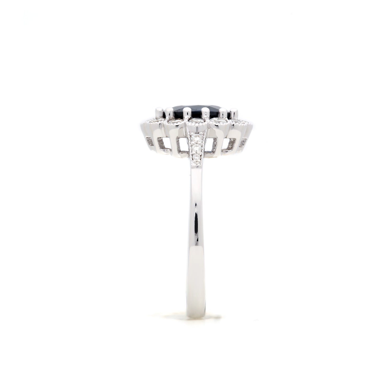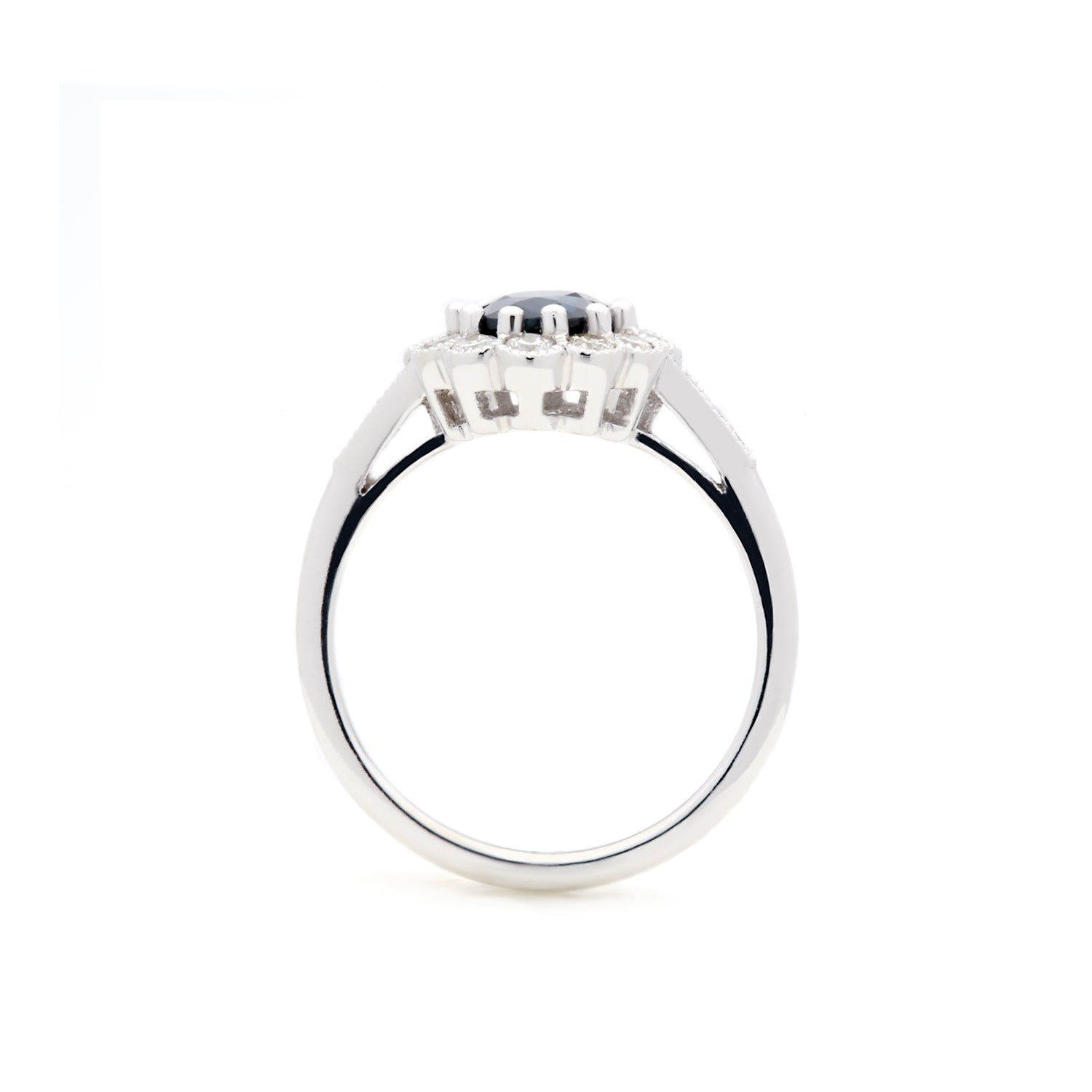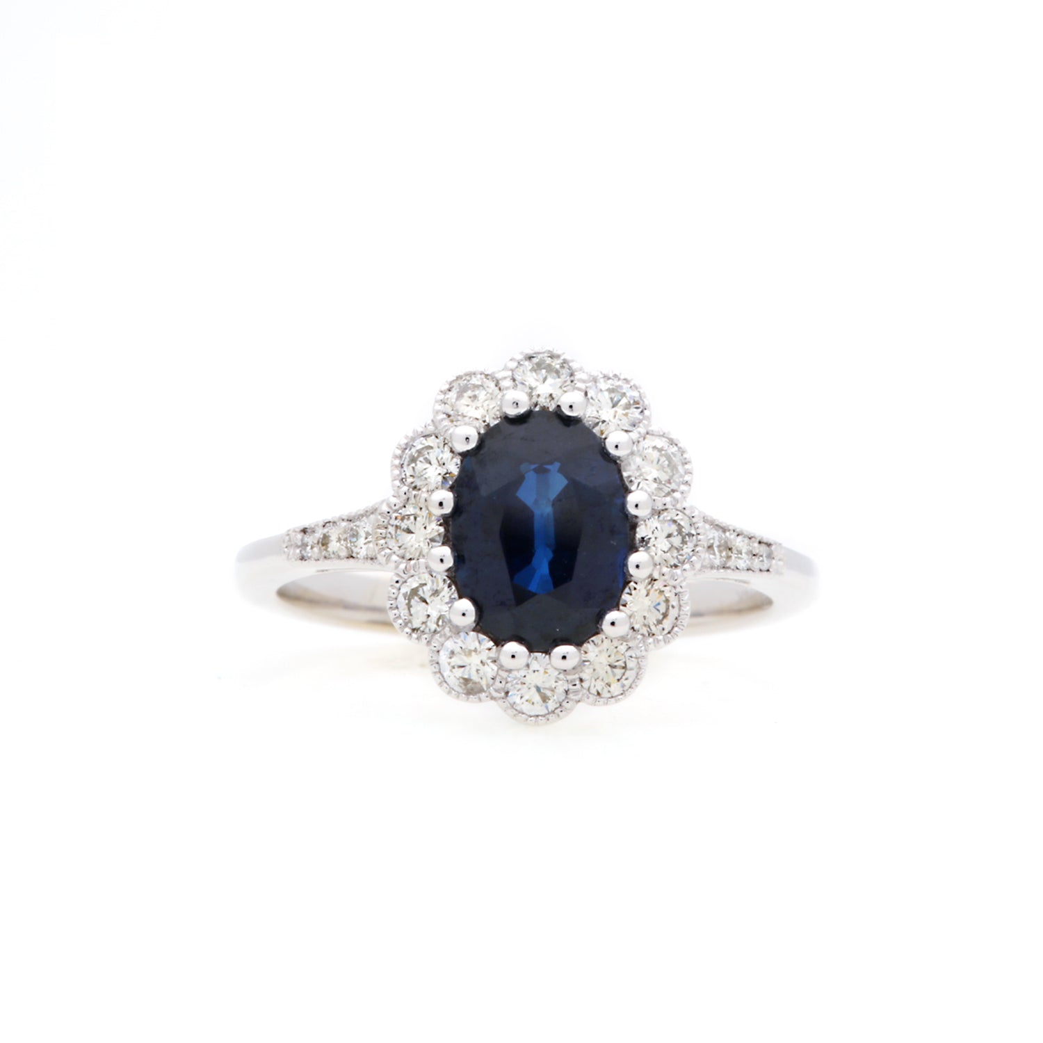 Jaylyn Aura is packed with diamonds around a 1.55ct natural blue oval Sapphire, which is set with 12 claws.. The 12 0.03 carat round brilliant cut diamonds are individually hand set in 14k white gold bezels. 6 round diamonds with a total weight of 0.055 carats are pavé set along each side of the 14k white gold band.