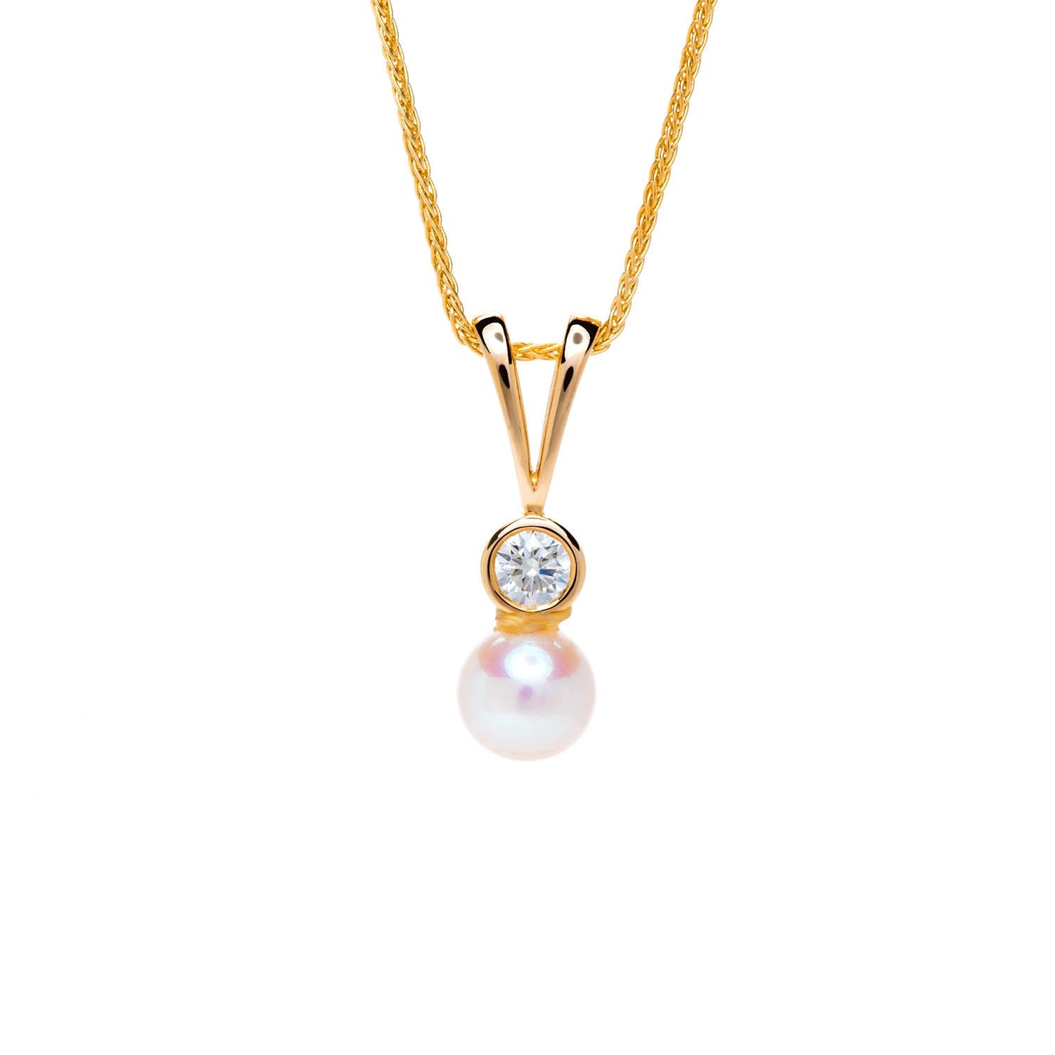 14 karat yellow gold pendant set with a round cultured pearls and diamond