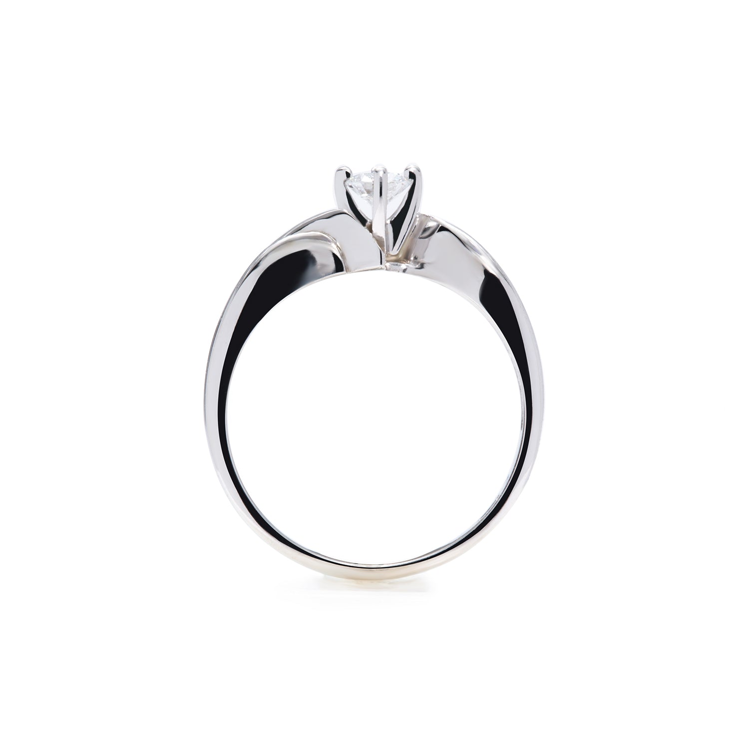 This 14k white gold ring is tapered, measuring 1.9mm at the bottom and 3.4mm at the widest. There is a single 4 claw white gold setting that holds a .20ct solitaire diamond.