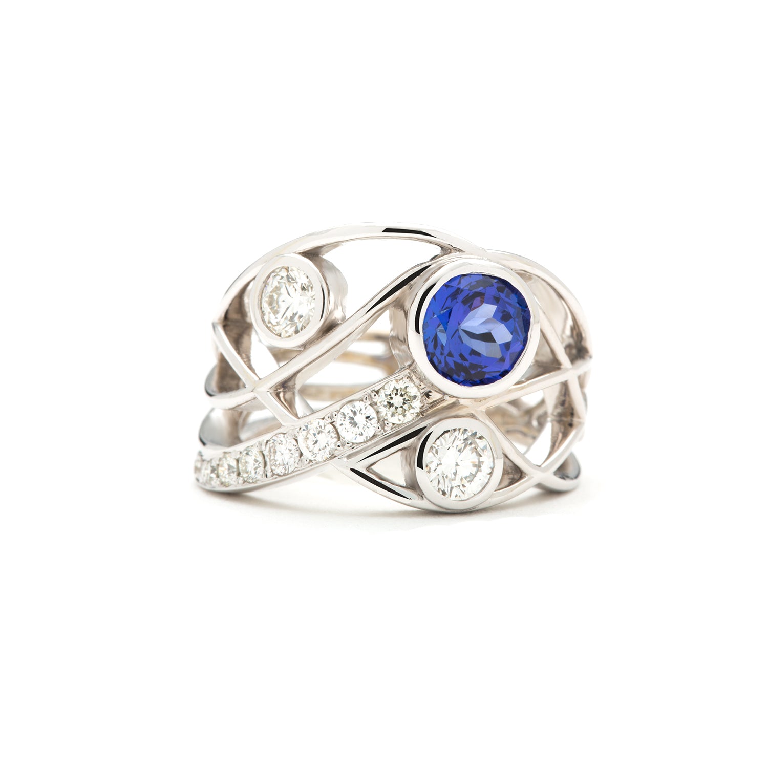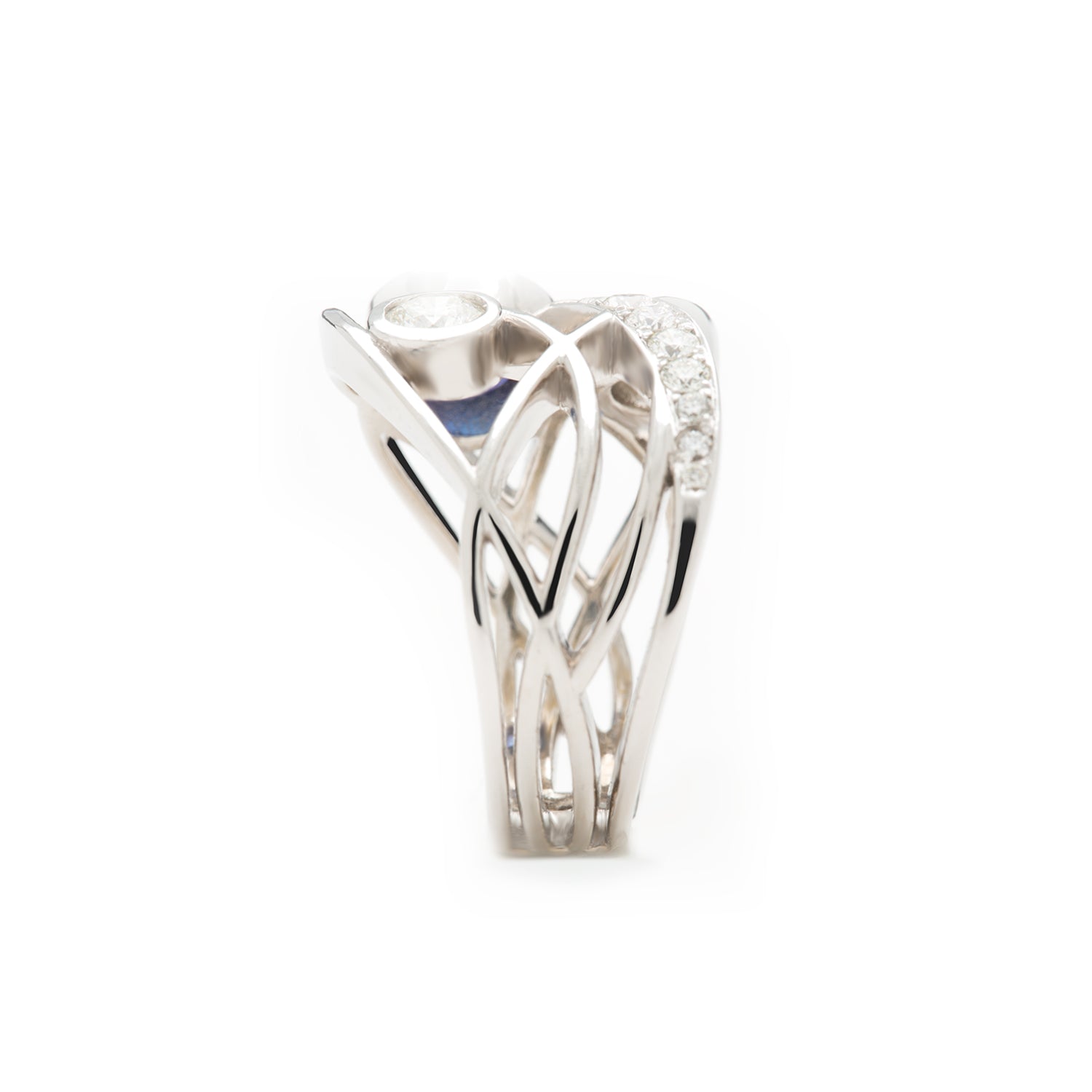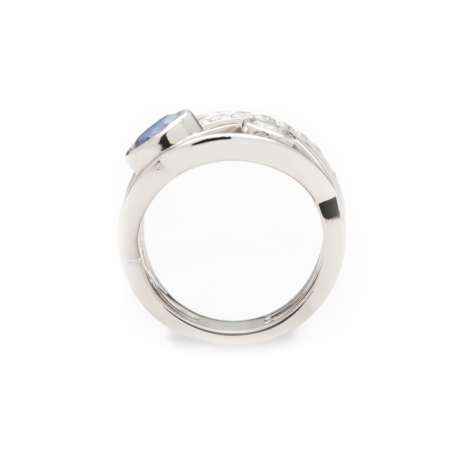 Tanzanite and Diamond 14 karat white gold freeform ring.
