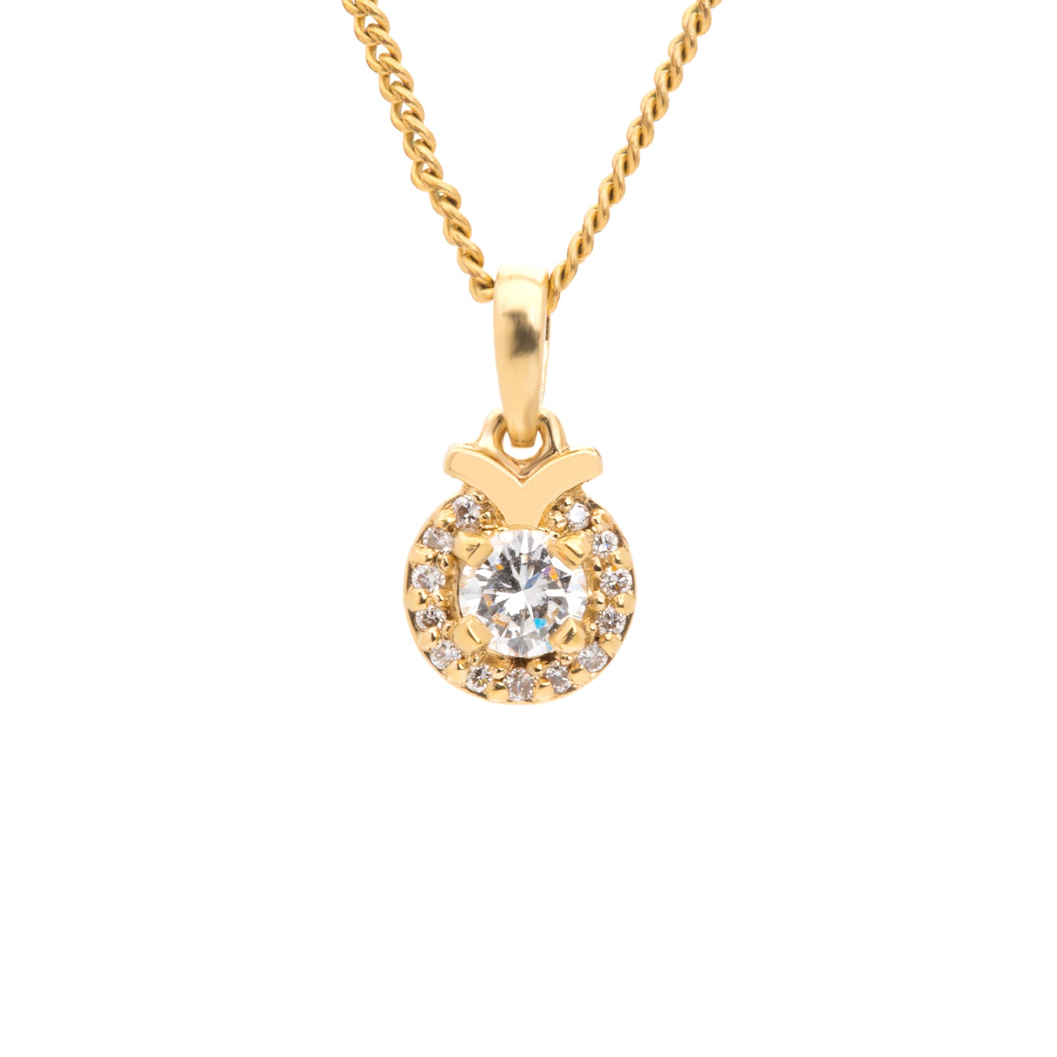 Lady's 14 karat yellow gold drop pendant set with 14 diamonds.