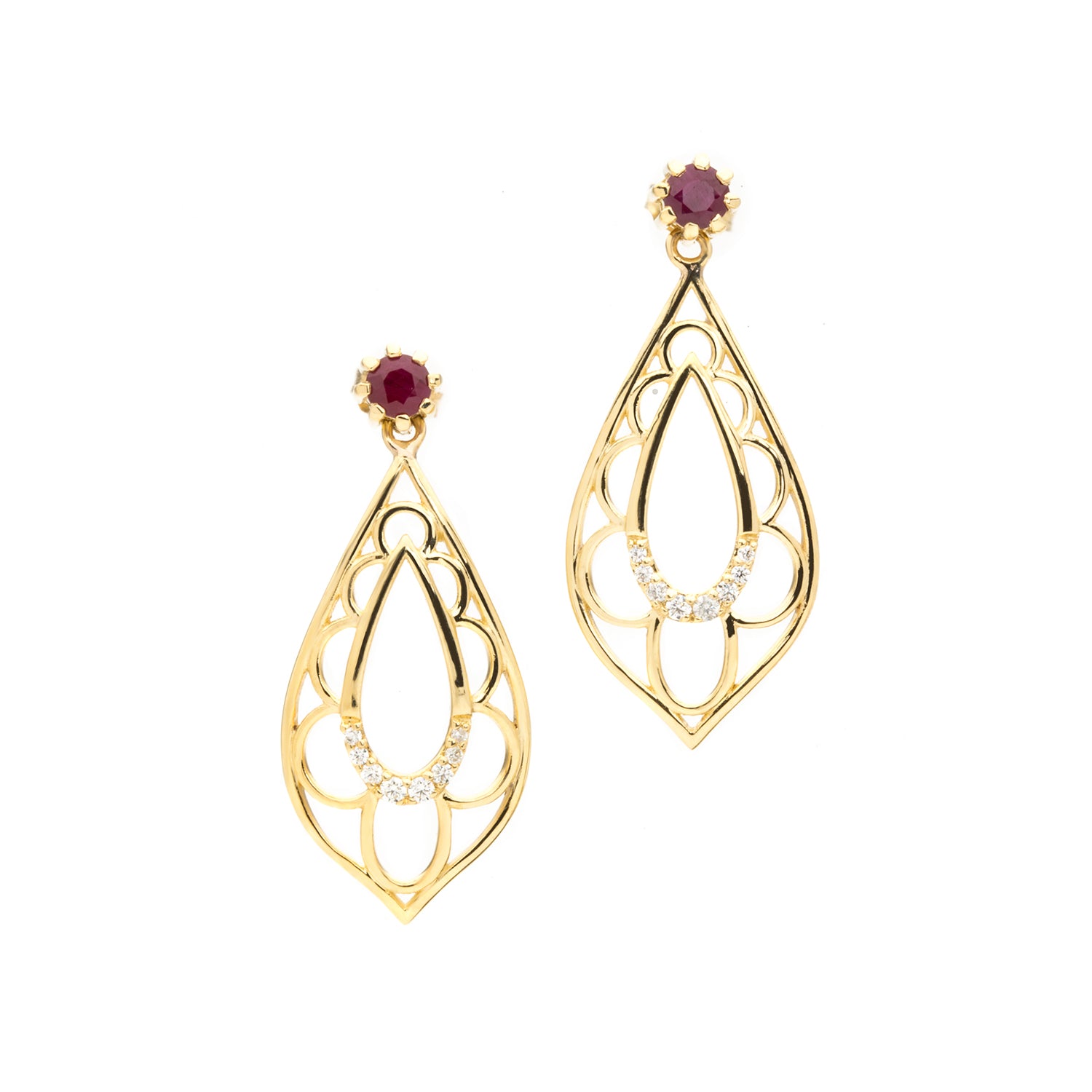 Inspired by Egyptian geometric designs, these yellow gold earrings drop 34mm from the posts. At each post 1 red ruby is set with 8 claws. The drops each house 8 round brilliant cut diamonds with 4 claw settings.
